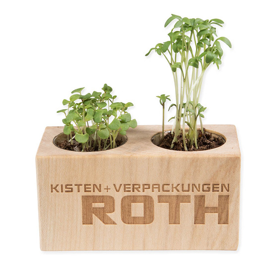 Mehr Platz für Blumen, Kräuter und die Werbeanbringung bietet das Pflanz-Holz-Set in der 2er-Ausführung. Die Töpfchen aus europäischen Holz werden mit beliebigem Samen und je einer Substrattablette als Erde geliefert. Viel Natur für Schreibtisch oder Fensterbank. Platz für Ihre Werbung findet sich auf der umliegenden Banderole. Optionale Lasergravur auf dem Gefäß möglich.
